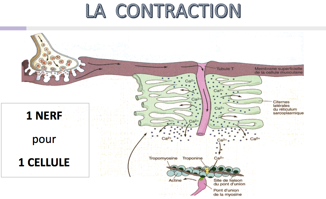 On a vu grâce à ce super schéma (ci dessous) que l'on va avoir la fixation de notre axone, l'onde va alors se propager dans le tubule T qui sépare nos 2 rétuculum sarcoplasmique. Ces réticulum vont libérer du Ca++ etc..