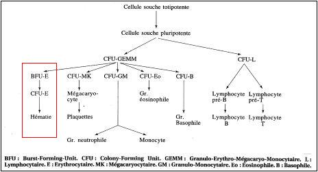 Pour l'érythropoïèse, j'avais cru comprendre qu'on avait le progéniteur hématopoïétique (CFU-S / GEMM) qui donnait ensuite BFU E → CFU E →Pro érythroblaste → Erythroblastes basophiles → Erythroblaste Polychromatophiles → Erytrhoblaste Polychromatophiles→ Erythroblaste acidophile → Réticulocyte → Hématie/Eritrhocyte/GR