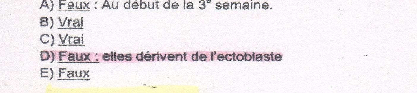 J'aimerais un éclairage sur cet item ! Je l'ai retrouvé dans les annales du tutorat et la correction, qui m'avait semblé "tatillon", spécifiée noir sur blanc "faux : elles dérivent de l'ectoblaste" ! J'ai trouvé ça extrêmement étrange comme correction mais je l'ai admise. Je trouve que c'est quelque peu décevant de retrouver cet item, sachant qu'on le trouve dans les annales avec un correction toute autre ... A méditer !
