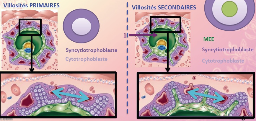 MEE va lui aussi pousser sous les expansions du cytoT qui vont pousser sur le syncitioT. Et ça forme les villosités secondaires (cf. schéma stade 6 ).