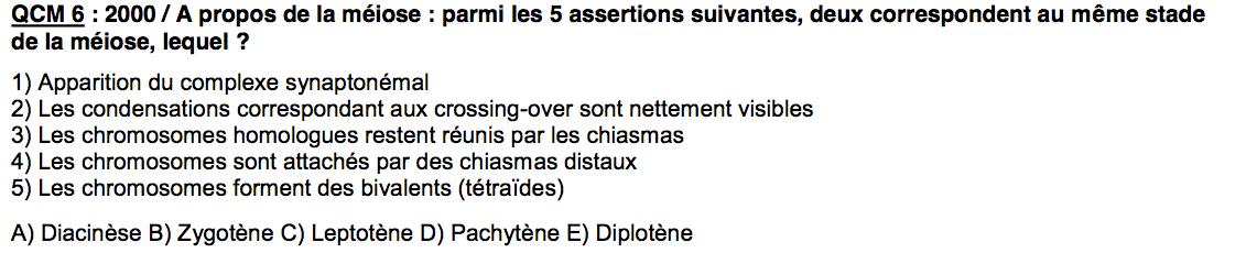 Après je le redis c'est un très vieux QCM et je ne pense pas qu'il puisse retomber formulé comme ça (en + la version était surement un peu différente) . Pour le concours, retiens bien la version de cette année pour chaque stade qu'il y a dans la ronéo 1. Et aussi si ça tombe essaye bien de voir ce que le prof veut te demander, en particulier pour les CO ou c'est un peu litigieux car ils peuvent commencer au zygotène et se terminer au diplotène, si tu vois que le prof demande quel stade est
