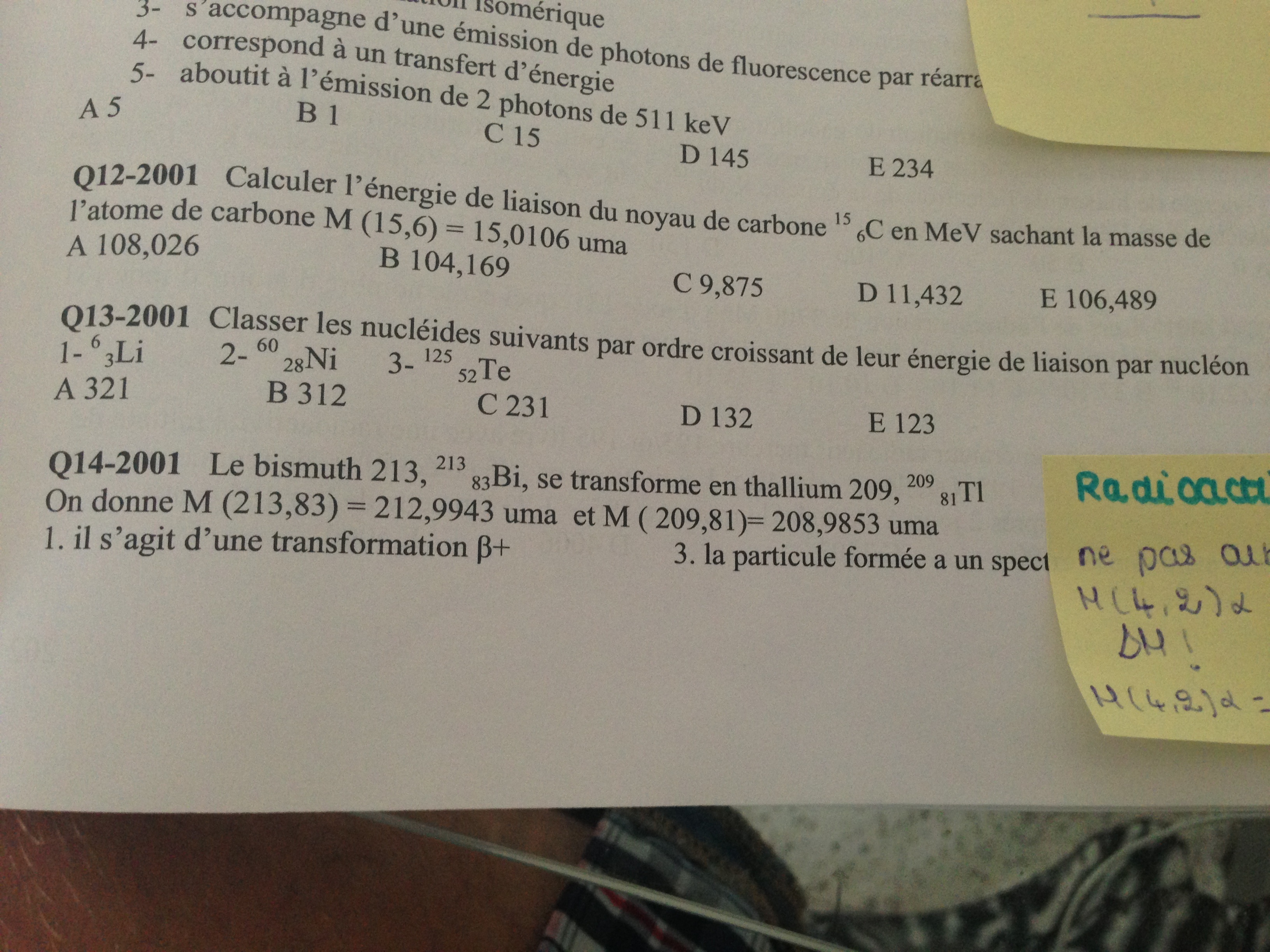 Pour le QCM 13 sachant que l'on a aucune donnée numérique sur les masses de ces atomes ou carrément sur leurs énergies de liaison je suppose que ce QCM se résout par connaissance du graphe présentant El/A en fonction du nombre de masse :