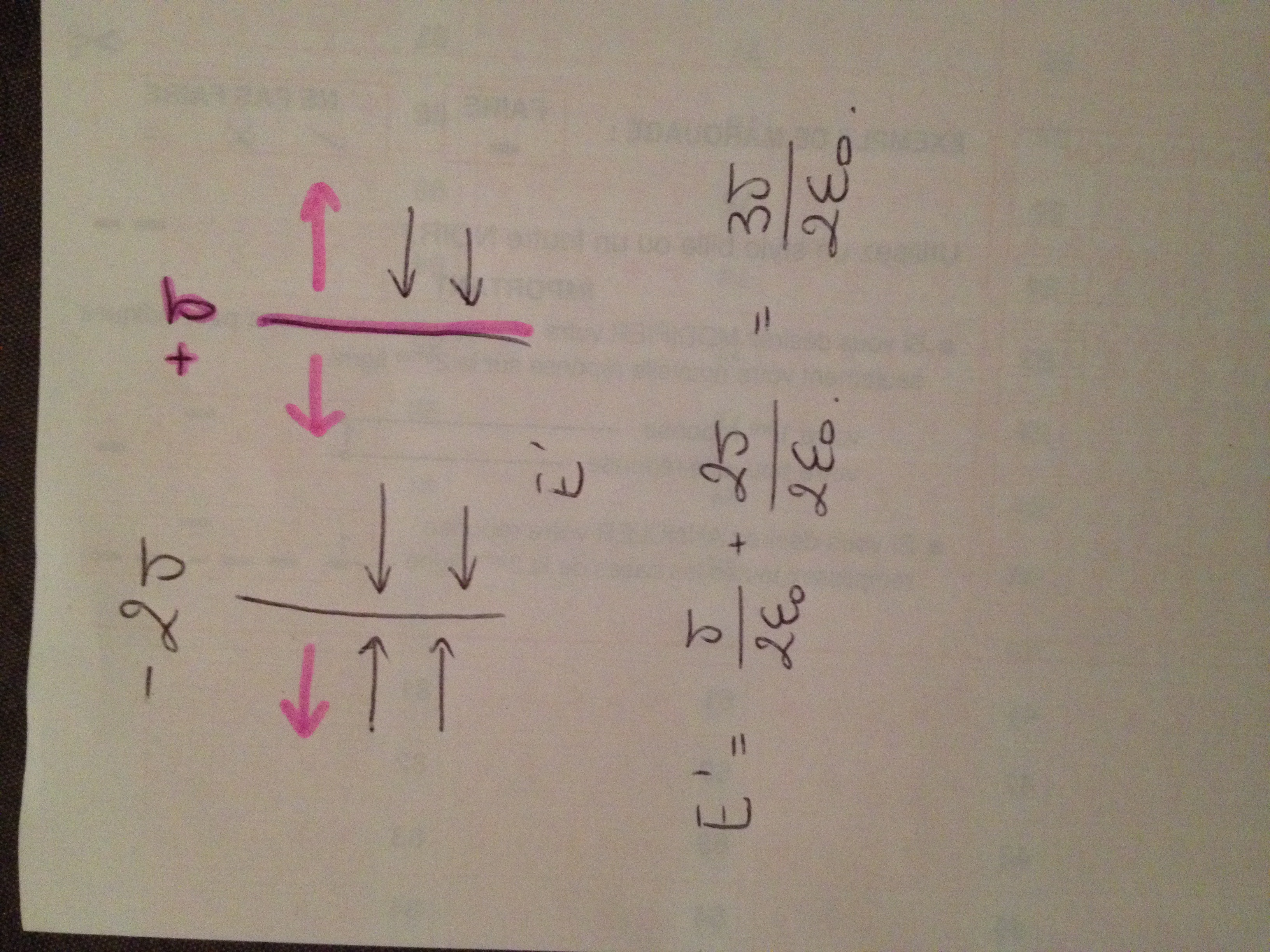 Je vais essayer de vous donner une technique simple pour répondre (et en plus elle permet de faire du dessin ) : - Vous dessiner vos plaques Petite règle : le champ + est répulsif; le - est attractif - Vous placer vos lignes de champs selon la règle, et vous dessiner un nombre de fleche proportionnel a la densité de plaque que vous avez (ex : densité de 2σ = 2 flèches. Comme ca chaque fleche représente soit σ/2ε ou -σ/2ε). - Apres il reste qu'a regarder et compter les flèches Vos fleches sont dans le même sens, alors vous les additionnait. En sens opposé alors elles s'annulent !
