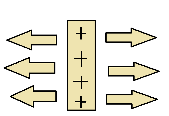 - Le plan est chargé positivement, on dit que le champ est répulsif, c'est à dire que les flèches vont s'éloigner du plan Illustration :