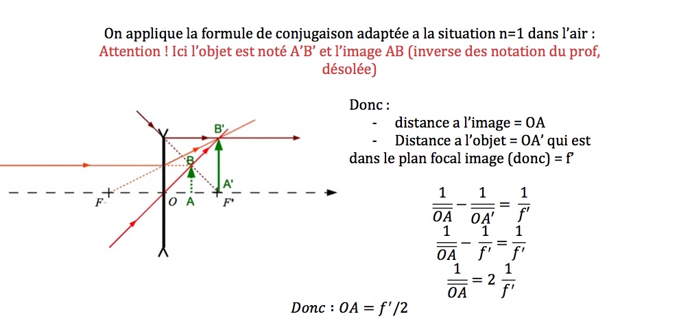 Si l’objet est dans le plan focal image, la distance image est égale à f'/2