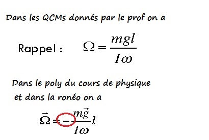 Yo les gars, et les gazelles, à propos de la vitesse angulaire de précession, soit je n'ai pas la bonne version d'un des deux polys (QCM ou cours), soit il y'a un - qui se trimbale (cf fichier joint) ou alors c'est parce que dans l'un des deux on a des vecteurs ? ...