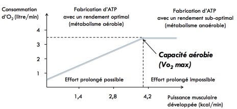 Donc à partir de cette valeur de 3kcal/min on ne peut plus ventiler plus d'O2. Mais on peut continuer à augmenter le travail musculaire grâce au travail anaérobie : on fabrique du lactate et on peut continuer la travail musculaire au delà de la limite fixée par l'oxygène.