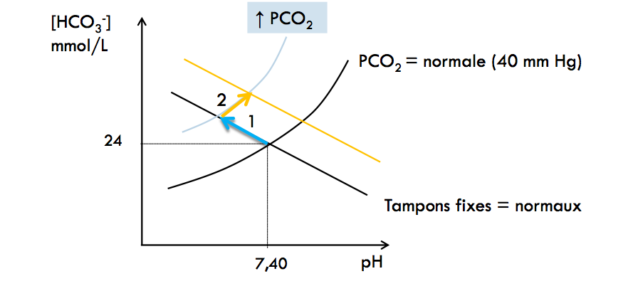 - augmentation de la PCO2 donc changement d'isobare (flèche 1)