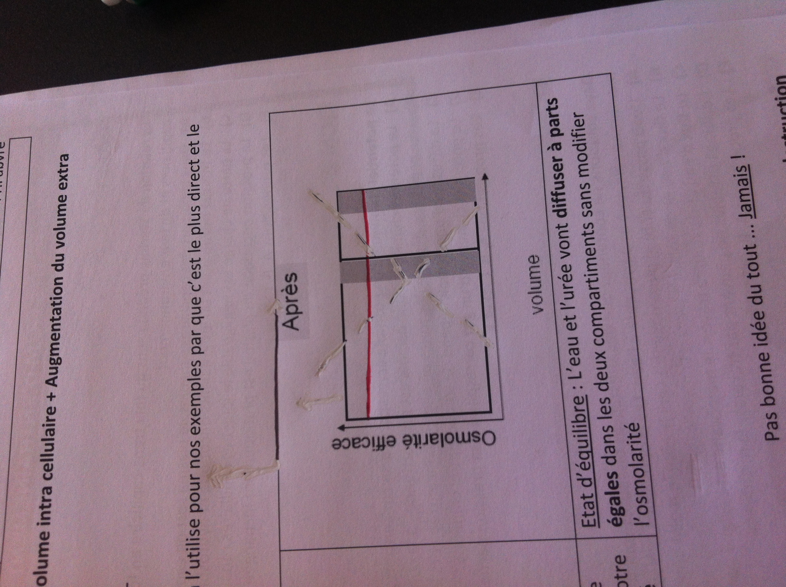 ... donc comment les volumes globaux se rééquilibrer en 2/3 1/3 ( pour moi c plus 2/3 1/3 mais un truc du style 1,8/3 1,2/3 car le volume extra augmente un peu ) Là je suis d'accord, ce n'est pas très logique... c'est lié à ce qui a été dit au dessus dans ta première question. Normalement : l'osmolarité devrait augmenter (on ajoute des osmoles) et la répartition de l'eau ne devrait plus respecter le 2/3 - 1/3 physiologique