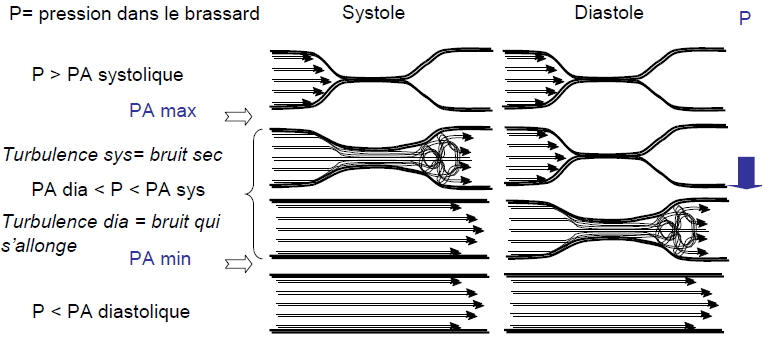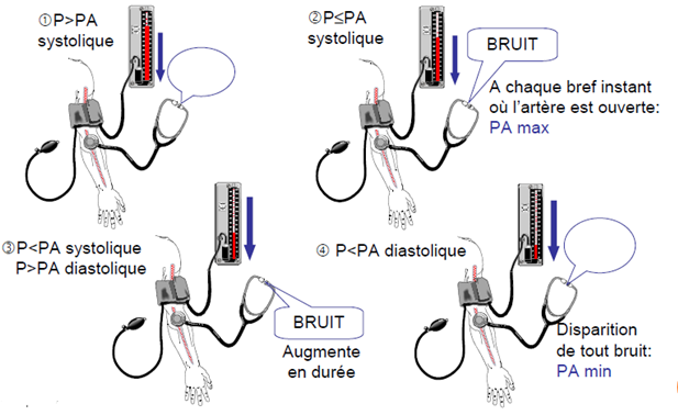 "Lorsque la pression dans le brassard devient inférieure à la TA maximale, on perçoit un bruit intermittent"