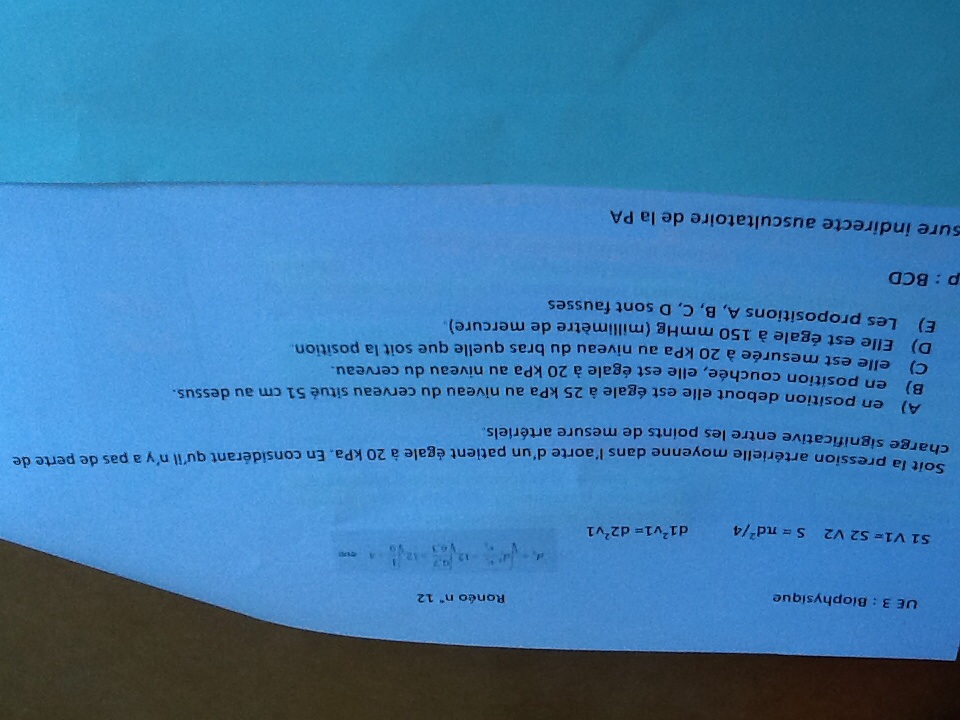 C : Vrai car (le prof nous le dit dans le cours) le bras est considéré à la même hauteur que le coeur et donc l'aorte donc si le patient est debout la bras est bien à 20 kPa et couché ben pareil que B ^^