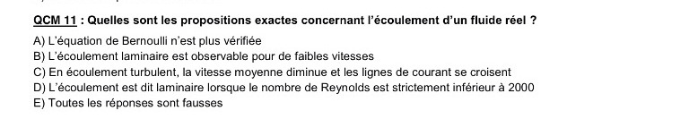 Bonjour :) Juste une petite question a propos de l'item D (compté juste) de ce qcm, dans un des qcm du prof pourtant on considerait que l'ecoulement etait laminaire pour un nombre de Reynolds inferieur ou EGAL a 2000, du coup je me demandais si on pouvait le compter faux? :cute: