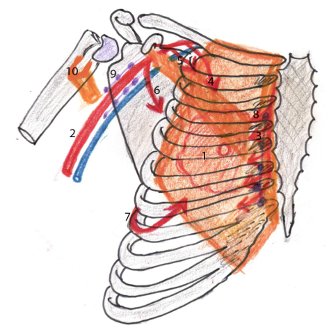 Tu vois le petit pectoral qui va s'insérer sur l'apophyse coracoïde et "par dessus" tu vois bien le grand pectoral avec ses trois chefs d'insertion.