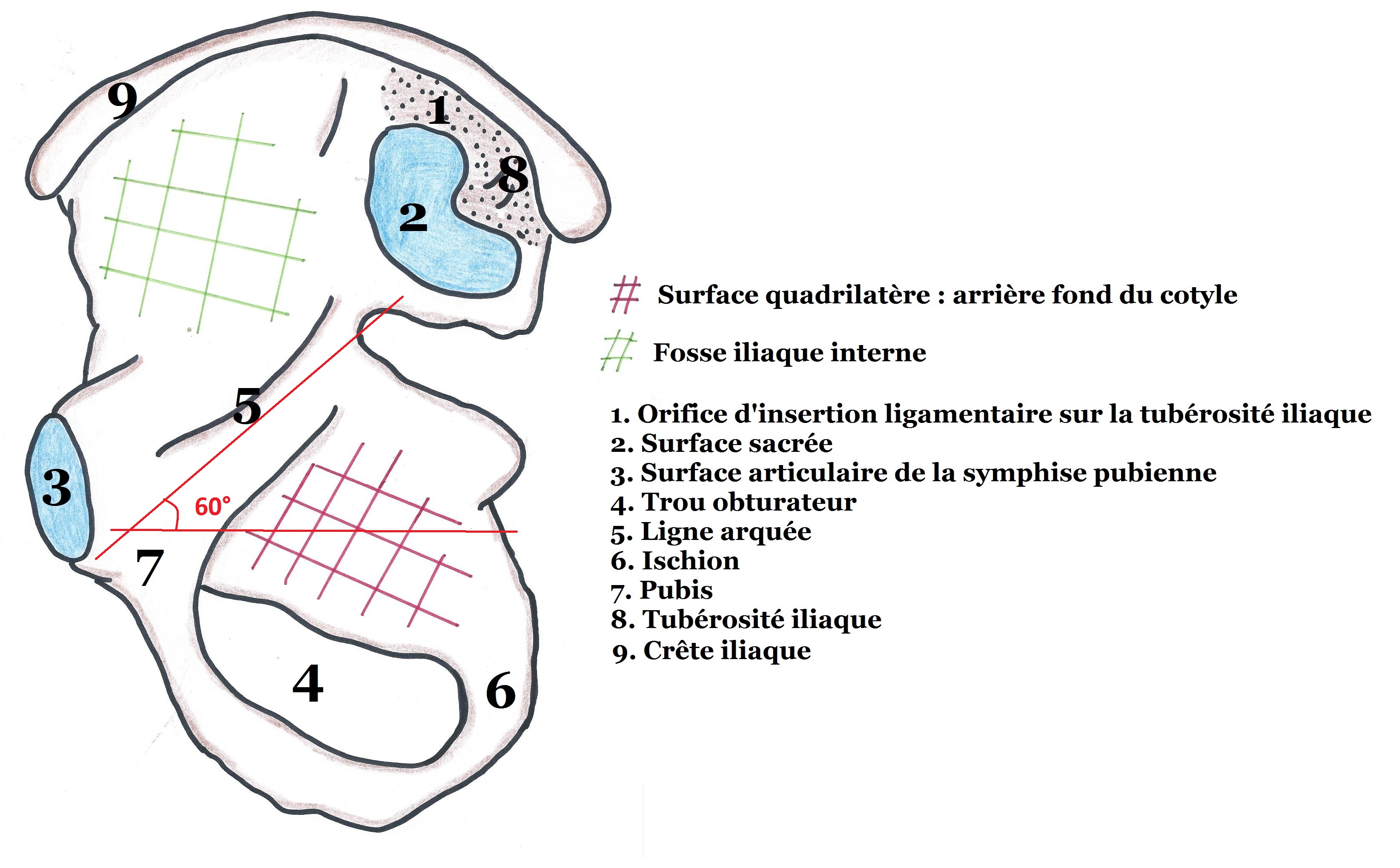 Alors pour le cours d'UE9 sur l'anatomie du petit bassin de la FEMME il faut que tu retienne que la ligne arquée fait un angle de 60° avec l'horizontal ouvert en arrière, ça n'est pas un lapsus.