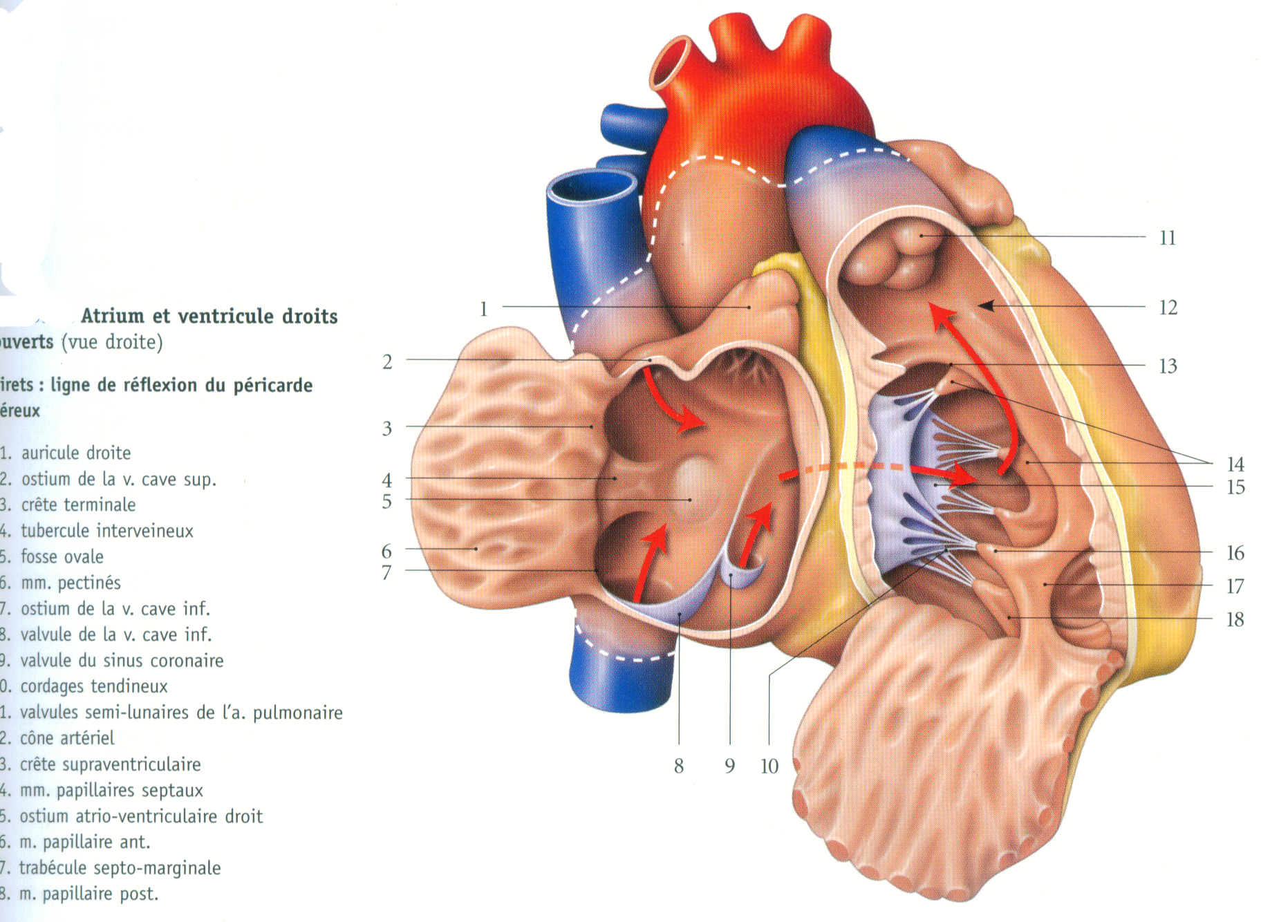 Bon, déjà, les deux se situent sur la face inférieure. La valvule d'Eustachi est entre la fin de la veine cave inférieure et l'atrium droit. Elle se trouve en plein milieu de la face inférieure, bien à plat.