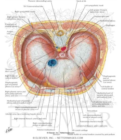 Je pense que c'est juste le dessin de la ronéo qui n'est pas très juste ! La bonne version c'est que notre oesophage est légèrement latéralisé à gauche. Regardez sur le schéma du Netter où se trouve le passage de l'oesophage dans le diaphragme en vrai le hiatus où il passe est carrément dans le milieu ^^ :