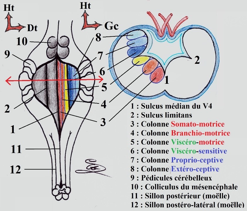 Au niveau du plancher du quatrième ventricule se trouvent les colonnes de noyaux des nerf crâniens.Si l'on part du sillon médian vers la périphérie on dire que: