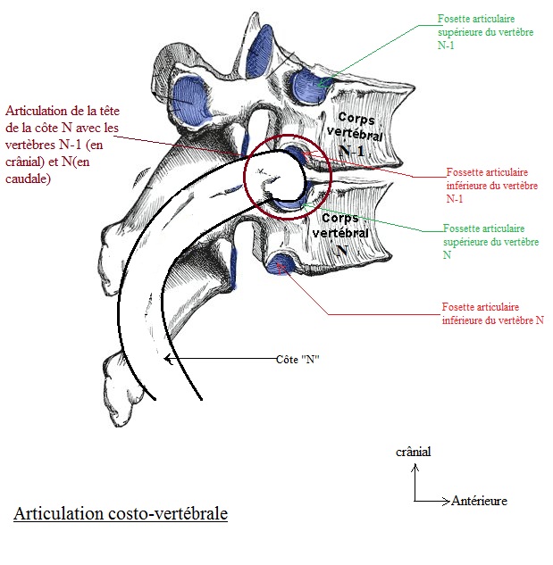 vraies côtes, elles s'articulent avec les vertèbres thoracique comme suit, entre les deux corps vertébraux :