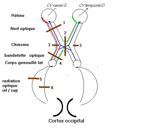 Le champs visuel nasal droit va aller se projeter sur la rétine temporal de l'oeil droit puis va cheminer dans le nerf optique droit puis aller au niveau du chiasme , la les fibres temporales ne décussent pas et vont se projeter au niveau du lobe occipital