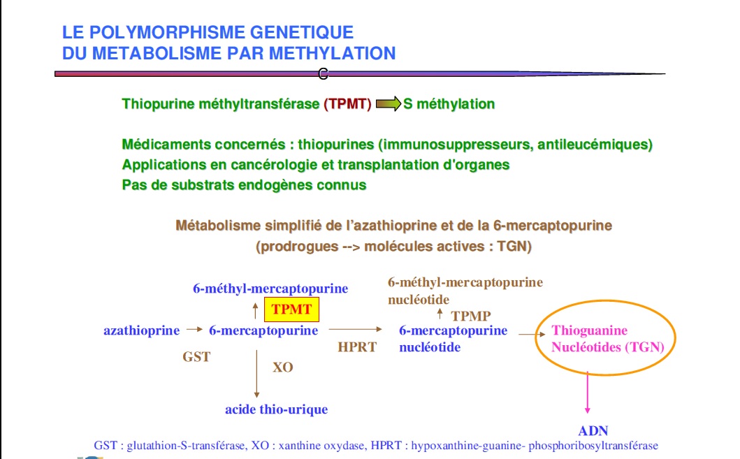 on a un médicament qui est un prodrug : l'aziathropine, qui doit être métabolisé en TGN pour être actif. Le TPMT est une enzyme qui va inactiver la voie de métabolisation en transformant le 6-mercaptopurine en 6-méthyl-mercaptopurine, ce qui va stopper la métabolisation de l'aziathropine.