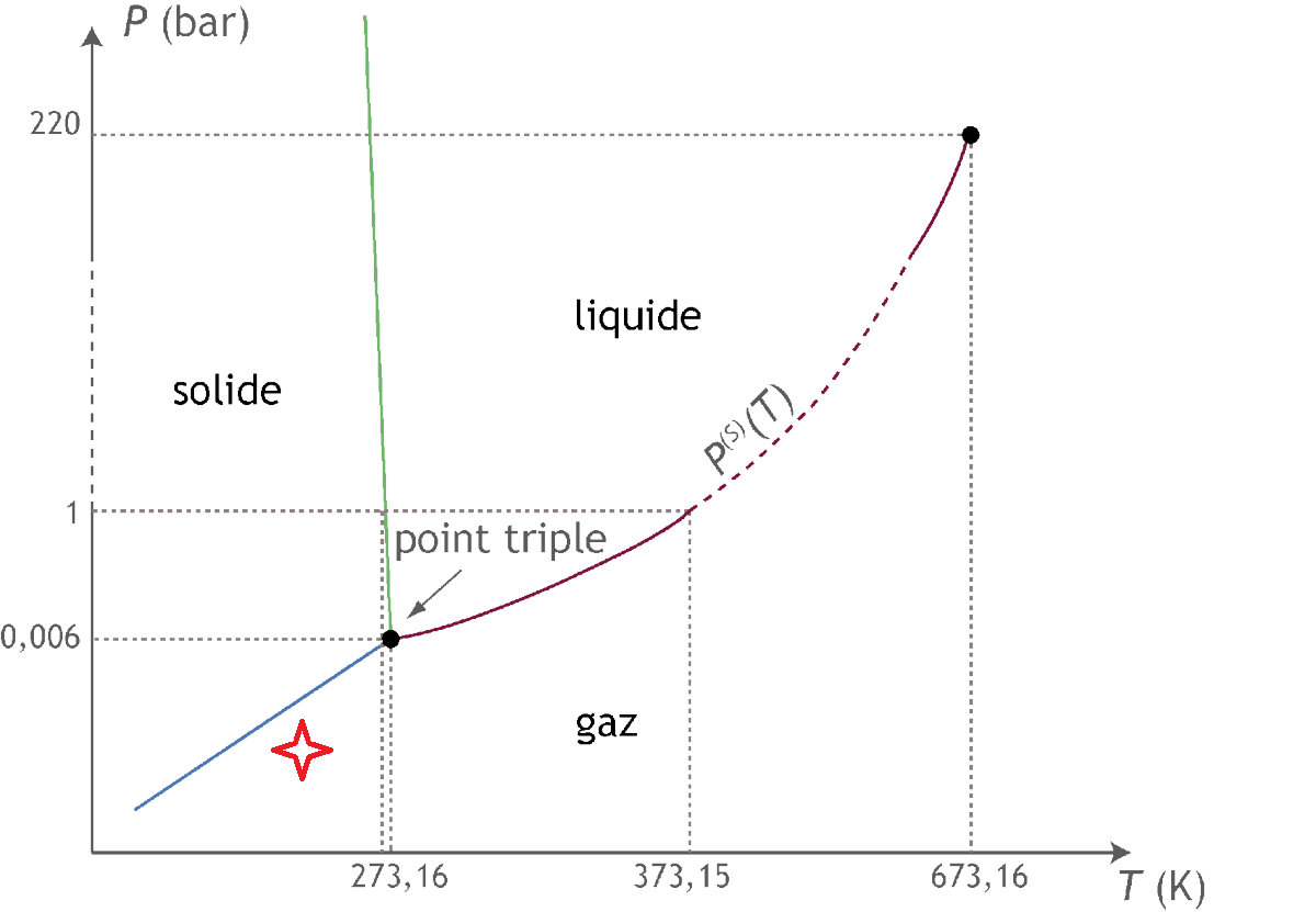 Mais je pense que en gros si tu imagine un récipient à l'intérieur duquel on a P=6,11 mbar, et T=273,16°K (cela correspond au point triple) tu trouveras dans ton récipient de l'eau sous forme liquide, solide, gazeuse et que ces états ne changeront pas, par exemple l'eau sous forme de glace ne fondra pas, sous forme liquide ne gèlera ou ne se vaporisera pas etc...
