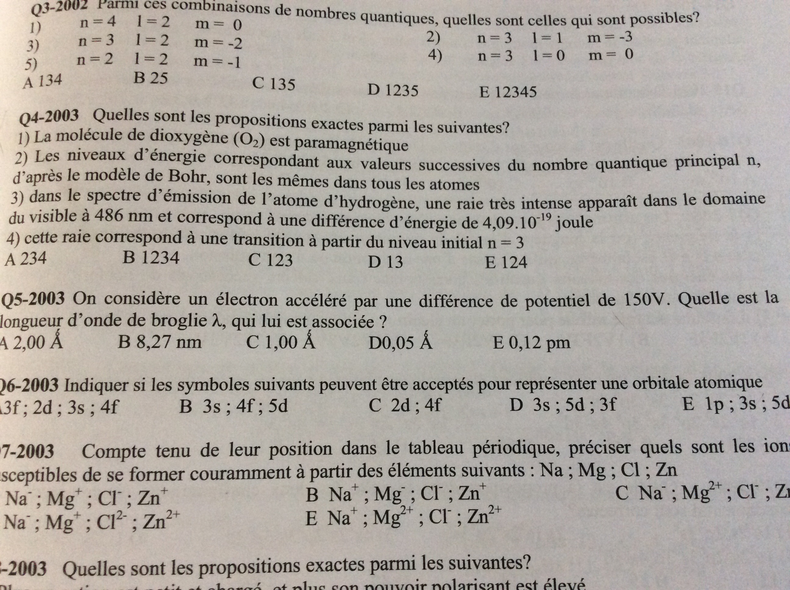 Pour le 5 : je trouve la réponse B en convertissant mes V en eV et en utilisant la relation de Hund et Duet .. La réponse dans le livre est la reponse C mais je ne sais pas comment la trouver ...