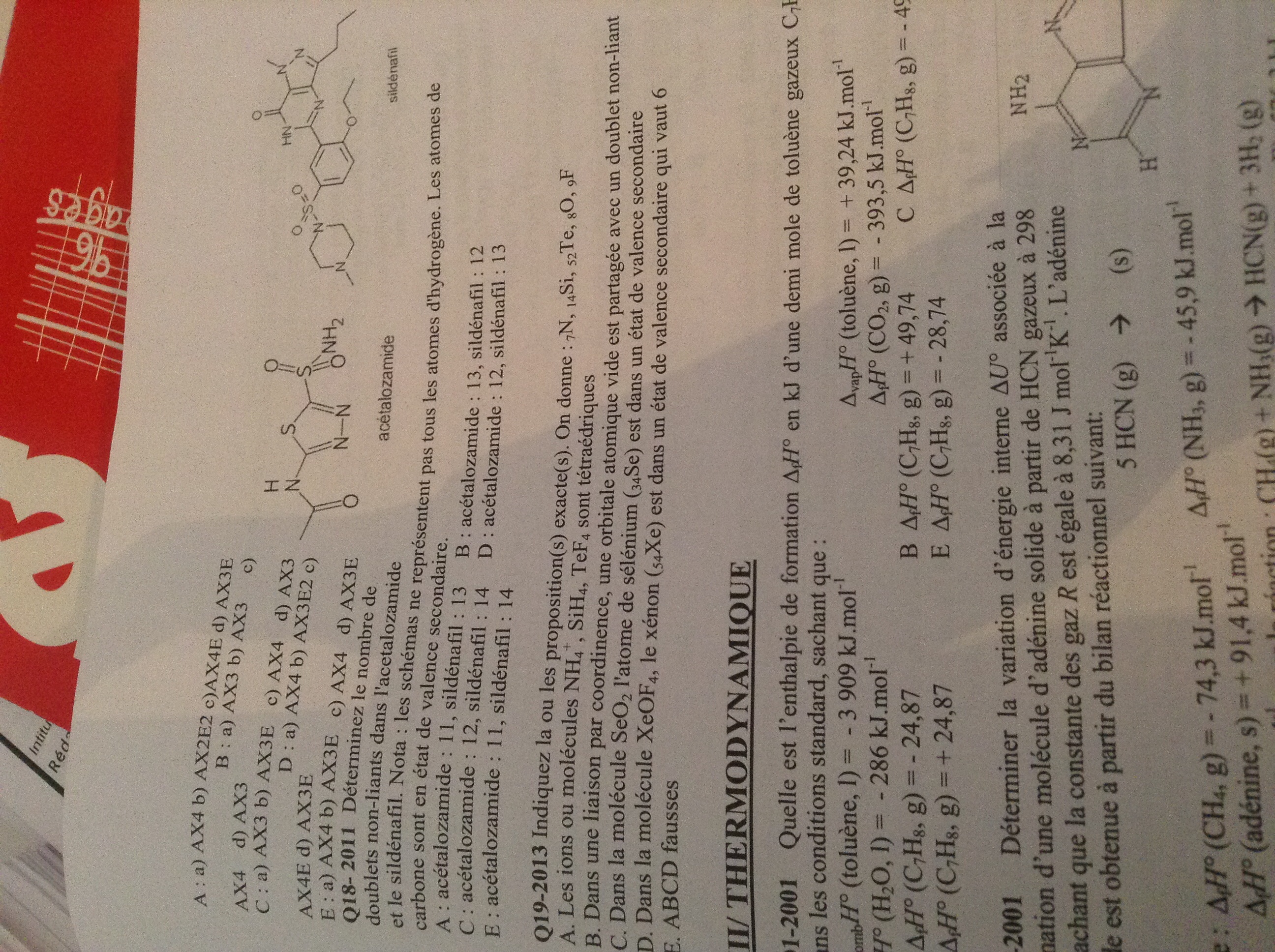 )Pour l'item A tétraédrique ça veut dire qu'il faut AX4. Je pense que NH4+ et SiH4 c'est bon mais pas TeF4. Quand on connaît pas un atome il nous donne son Z pour qu'on le place dans le TPE (ici Te = 52) du coup il est à deux "cases" du gaz parfait Xe54 donc il a la forme de l'oxygène 2 DNL et deux de valence