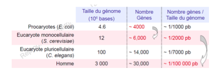 - eucaryotes MONOcellulaire : 1gène/ 2000 pb (taille du génome)