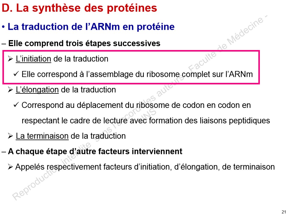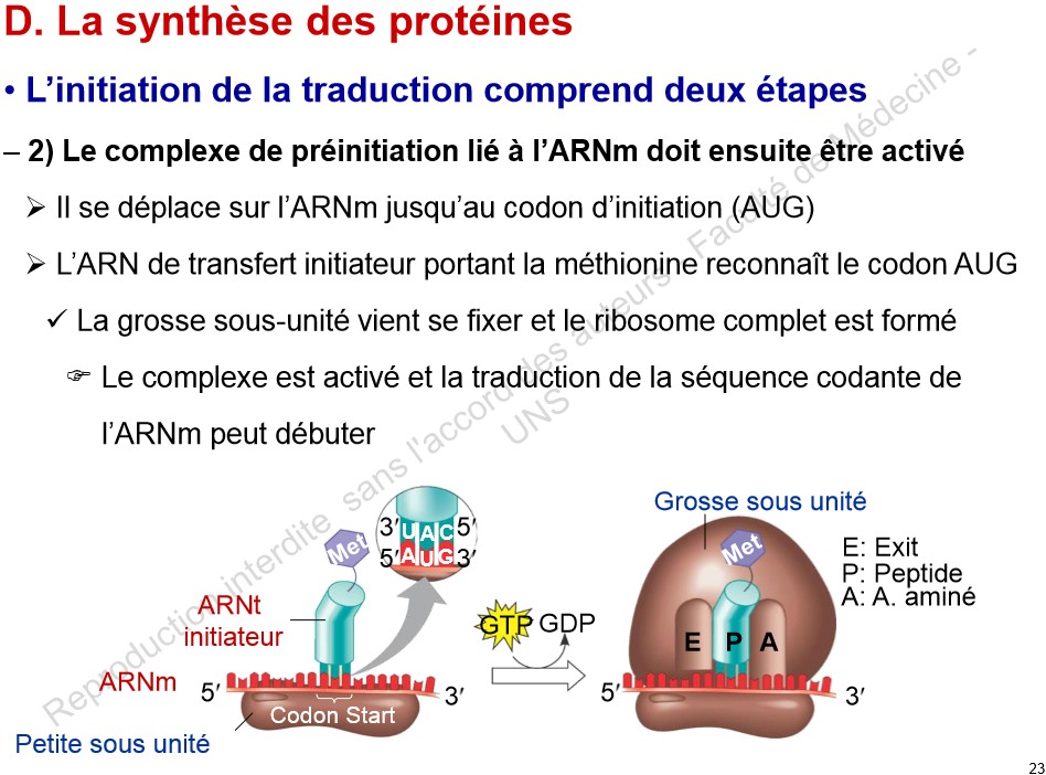 puisque j'ai retrouvé la phrase dans les polys du prof (poly2 diapo21):Ce qui me gène c'est que du coup je ne comprends pas vraiment pourquoi il parle du complexe qui doit être activé pour que la traduction puisque commencer (poly2 diapo23). Pour moi le complexe c'est le ribosome (avec sa grosse et sa petite sous unités) et l'ARNt. Du coup je trouve que c'est un peu contradictoire avec la diapo juste au dessus. L'initiation de la traduction commence lorsque le ribosome est complet ou quand on a notre ribosome complet et notre ARNt? A moins que lorsqu'on dit ribosome complet cela comprend l'ARNt avec ça méthionine en plus du ribosome avec ses sous-unités?