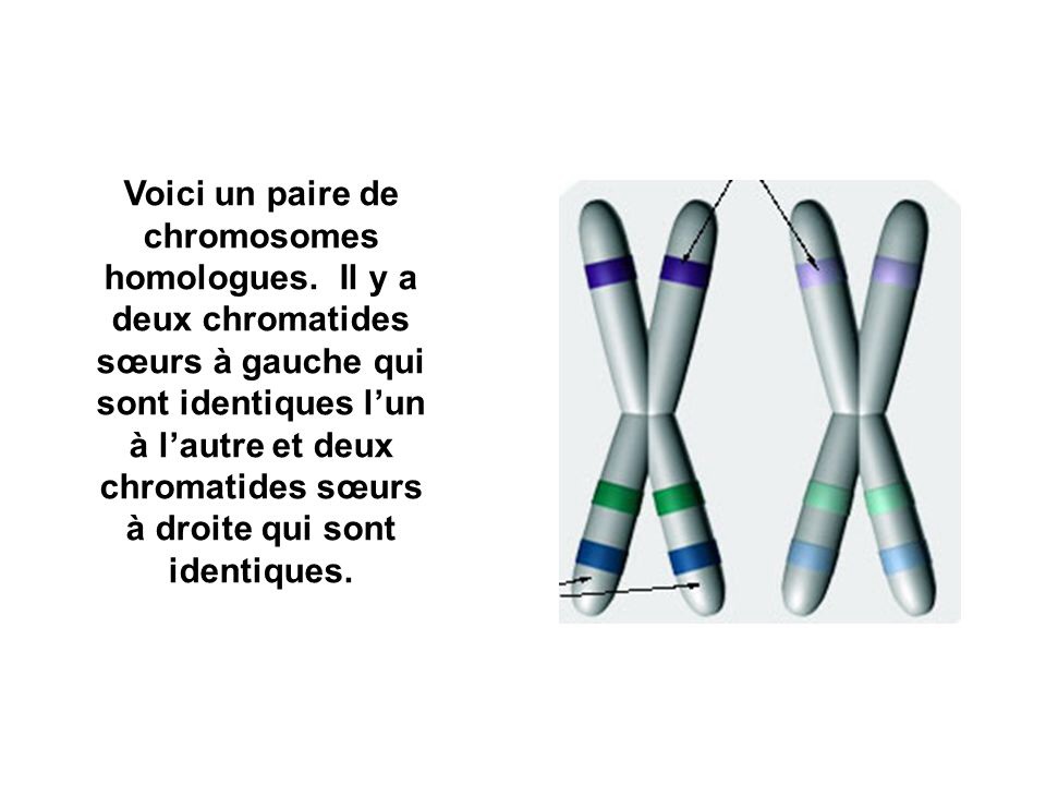 Chromatides soeurs: même chromosome, identiques en tout point (même allèles) car elles sont issues de la réplication
