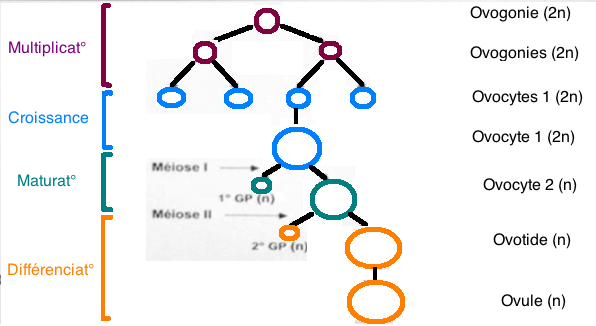 Tu peux vois sur ce schéma les 4 stades fondamentaux de la gamétogénèse.