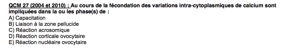 La réponse est ACDE, mais j'ai un problème avec la réponse B qui pour moi n'etait pas fausse, parce qu'il y a bien implication de calcium lors de la réaction acrosomique pour moi, si quelqu'un peut eclaircir ce point ? (Sachant que dans un autre QCM la phase reaction acrosomique est bien sur comptée juste)