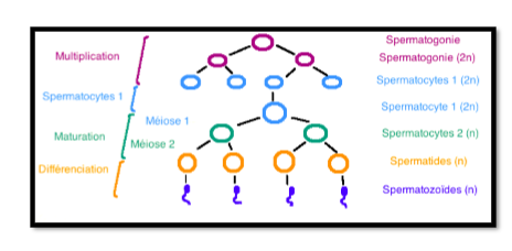 On a notre spermatogonie qui donne deux spermatogoinies par mitose,