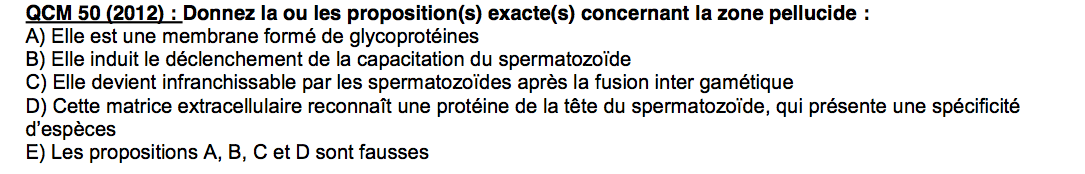 Salut désolé de réouvrir ce post mais en lisant la ronéo 3 p5 en haut c'est écrit à propos des 2/3 antérieur de la tête sur la membrane cytoplasmique “ il y a des Rc qui vont reconnaitre de manière spécifique une protéine complémentaire au niveau de la ZP de l'ovocyte “ donc je suis plutôt d'accord avec BOB c'est le SPZ qui reconnait et pas l'ovocyte
