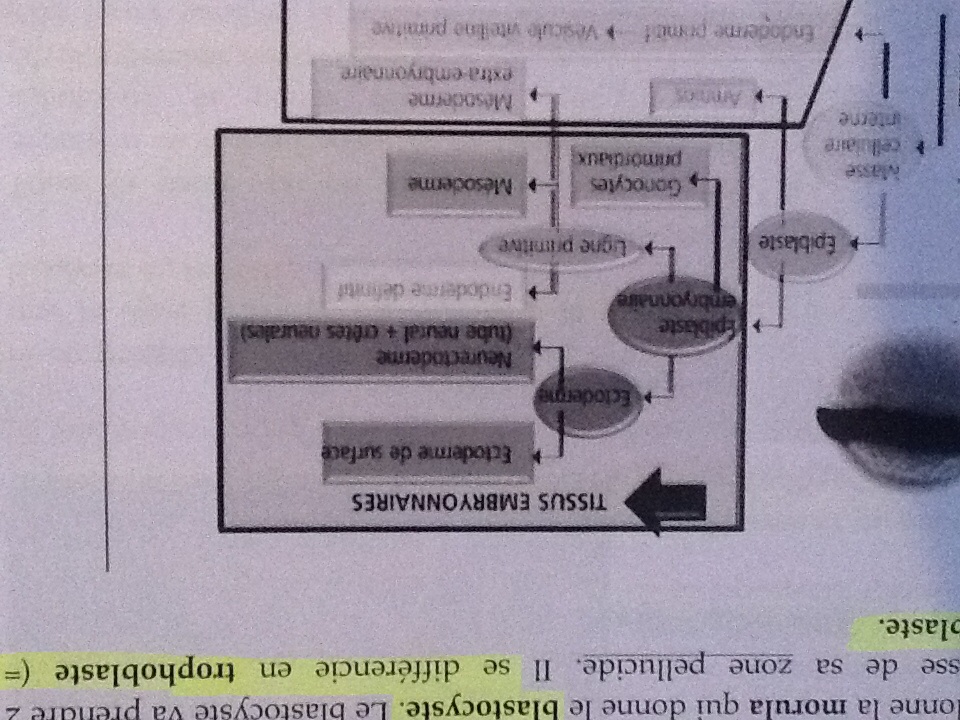 On a donc lepiblaste qui se transforme en ectoblaste et grâce à la chorde on aura la transformation de lectoderme/ectoblaste en neuroectoderme et ectoderme de surface (c'est vrai quon dit pas trop ectoblaste de surface, c'est pas faux mais bon là on considère vraiment que c'est plus un bébé feuillet donc on met derme et pas blaste à la fin)
