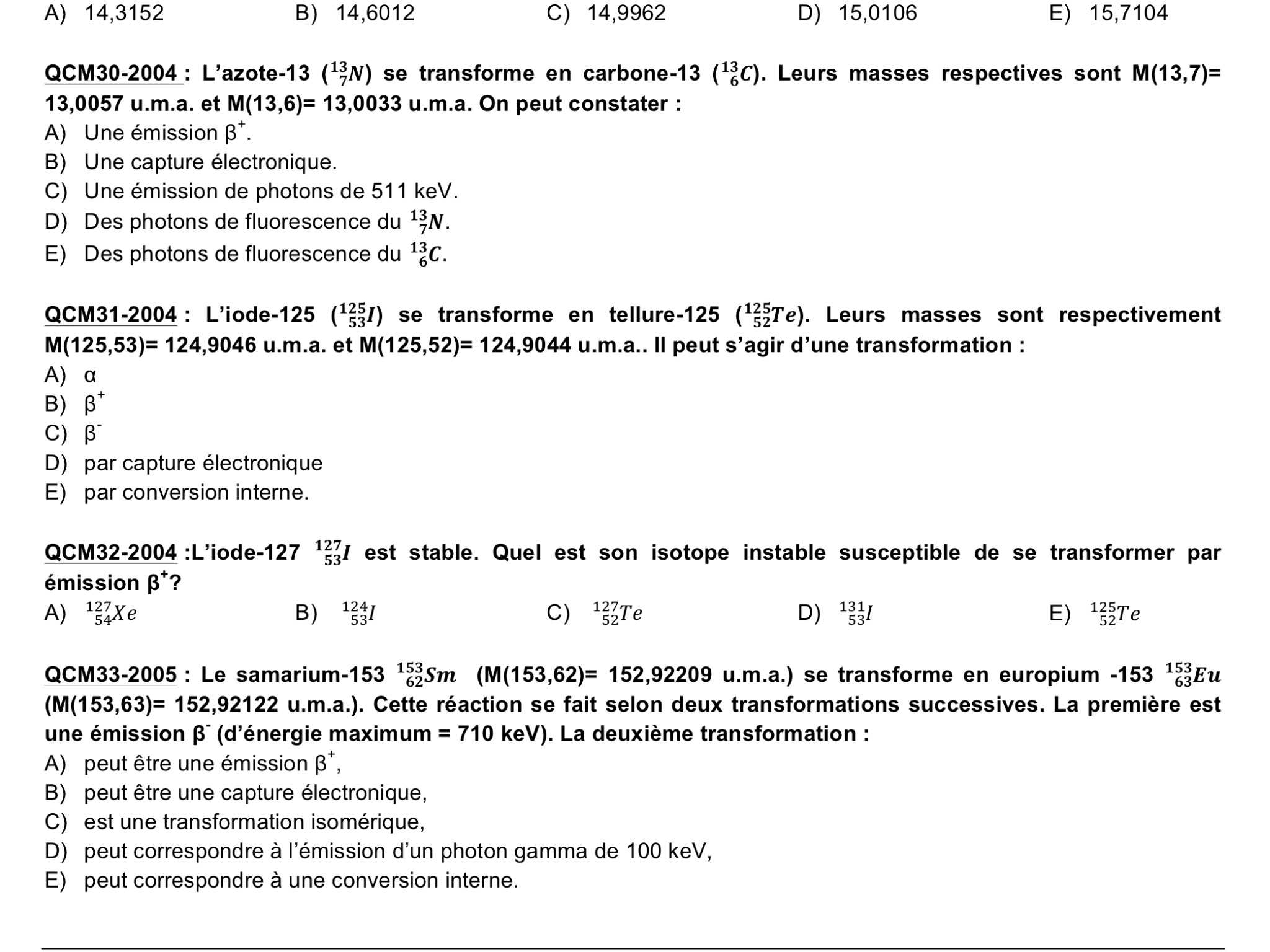 Pour répondre à ce QCM il faut te rappeler de la vallée de la stabilité.