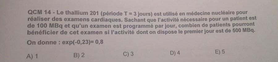 Puisque l'activité nécessaire pour un patient c'est 100 MBq et que la période est de 3 jours (donc au bout de 3J il reste seulement 250), donc il y a 2 patients (réponse B) qui peuvent bénéficier de cet examen non ? Dans le corrigé c'est marqué réponse C (3patients). :crying: :crying: