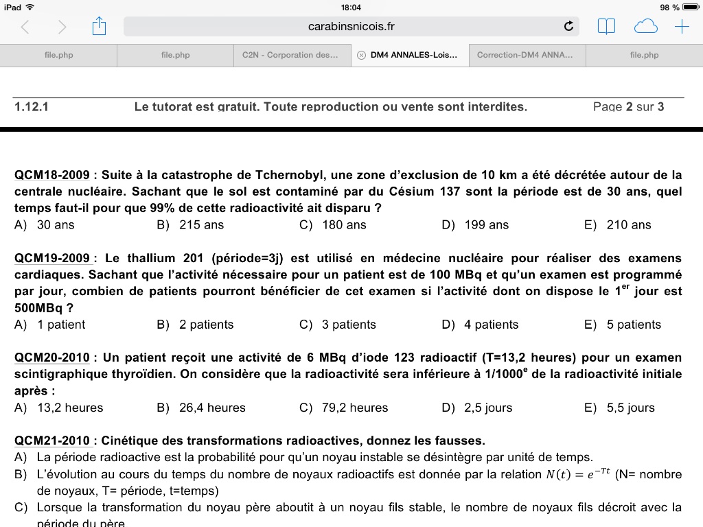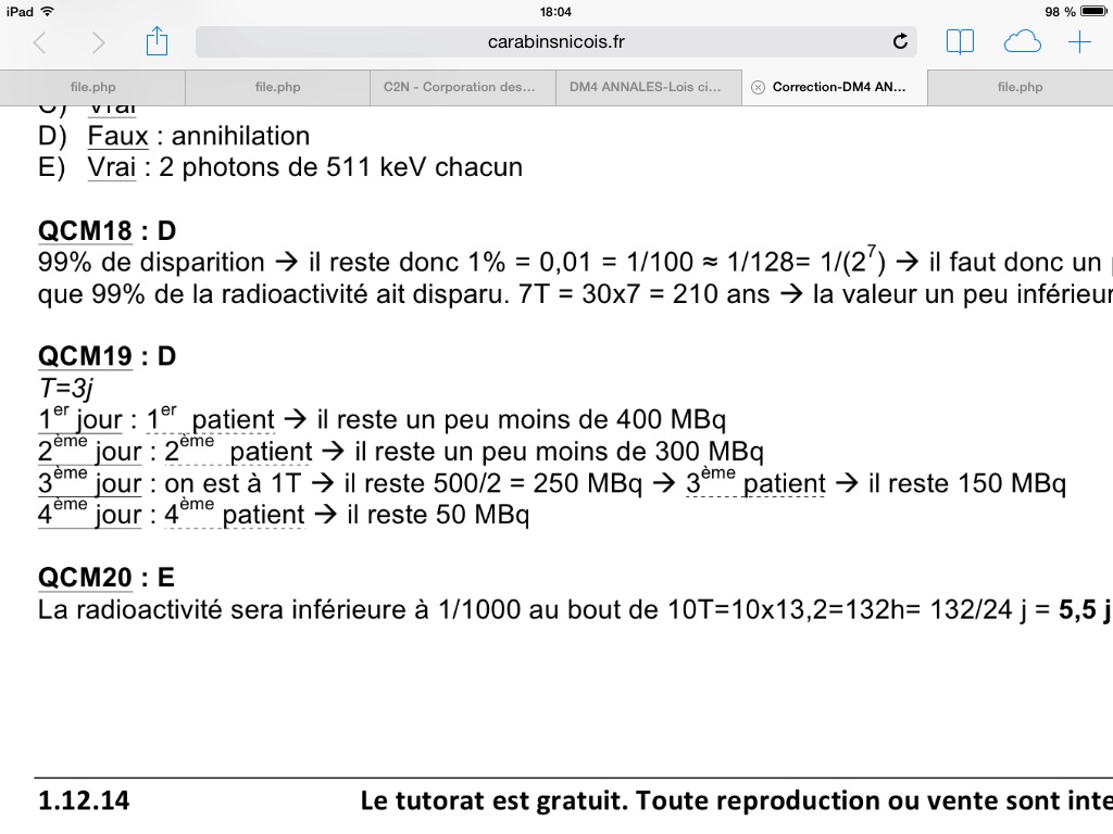 Salut :D j'ai un petit souci par rapport au QCM 19 je comprend pas du tout le raisonnement qui est fait dans la correction ..surtout pour le 3ème jour ..pourquoi on passe de 250MBq à 150 MBq ??