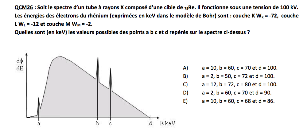 Voilà alors j'ai un problème avec ce genre de QCM je ne vois pas du tout comment le résoudre, je sais que déjà il faut regarder la tension (qui est là de 100 kV) et que ca nous donne la valeur maximale de la courbe (donc D), mais apres pour les autres raies je ne vois pas du tout, j'ai essayé en calculant la difference entre les differentes energies des couches mais ca ne marche pas non plus si quelqu'un peut m'aider ?