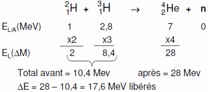 Donc le raisonnement pour calculer est très simple, par exemple si tu connais les énergies de liaisons moyenne en MeV par nucléons avant et après eh bien tu multiplies par le nombre de nucléons pour chaque noyaux soit le deutérium, le tritium et tu les additionnes. Pour l'hélium issue de la réaction de fusion tu fais pareil et tu fais une bête soustraction c'est tout!
