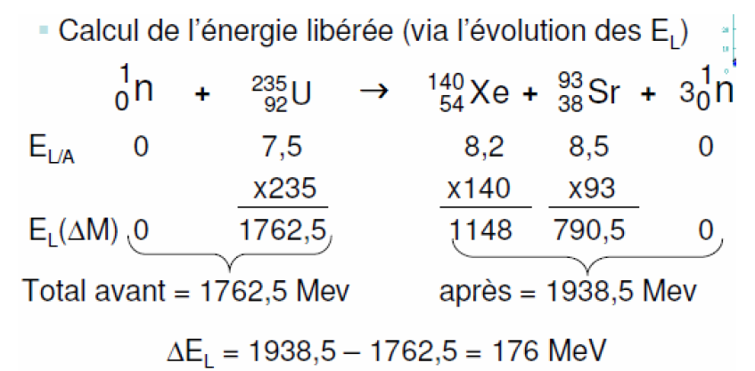 Je t'ai dit qu'il s'agissait d'effectuer une soustraction, pour avoir la différence entre l'énergie final (après la fission) et l'énergie initial (avant la fission). Donc tu comprends qu'il il s'agit dans ce raisonnement de soustraire les énergies de liaisons finaux avec les énergies de liaisons initiaux pour les différents paquets de nucléons qui ont rejoint leurs atomes respectifs sauf pour les neutrons.