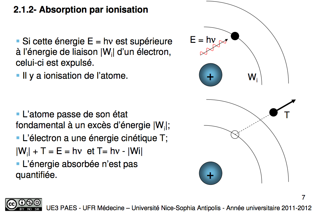 Dans la fiche des tuteurs, il est dit qu'il pouvait y avoir une ionisation si l'énergie du photon incident est supérieure ou égale à l'énergie de liaison |Wi| de l'électron sur son orbitale.