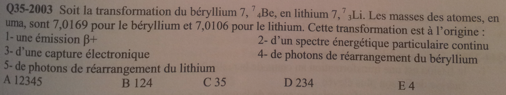 La réponse donnée c'est E, j'aurai mis juste la 4 parce que y'a pas B+ l'énergie est inférieure à 1,022 MeV, pas B- parce que c'est pas ça comme transformation, pas alpha non plus et pas CI. Merci encore.