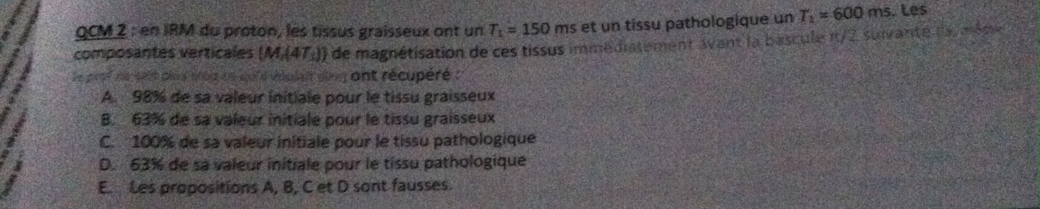 Si je devais arranger l'énoncé, je dirais "... Au bout d'un temps correspondant à 4 T1 du tissu sain les composantes verticales Mz(T1) de magnétisation de ces tissus [...]". Mais je ne sais pas ce qui a été effectivement dit en cours donc bon. En tout cas la correction donnée en cours est clairement en accord avec le QCM des annathèmes.