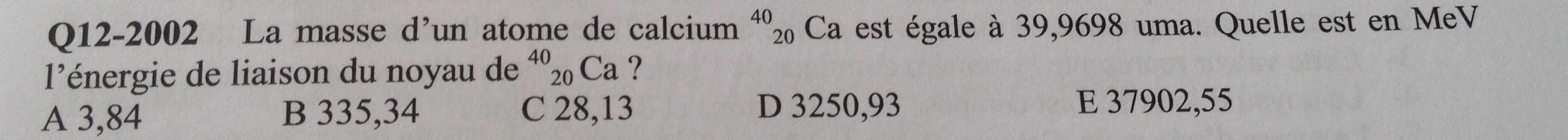 ∆M= ∑masses des nucléons - M(atome formé) = (20 x m(proton) + 20 x m(neutron) - M(atome formé)) = 20 x 1,007 + 20 x 1,009 - 39,9698 = 0,3502