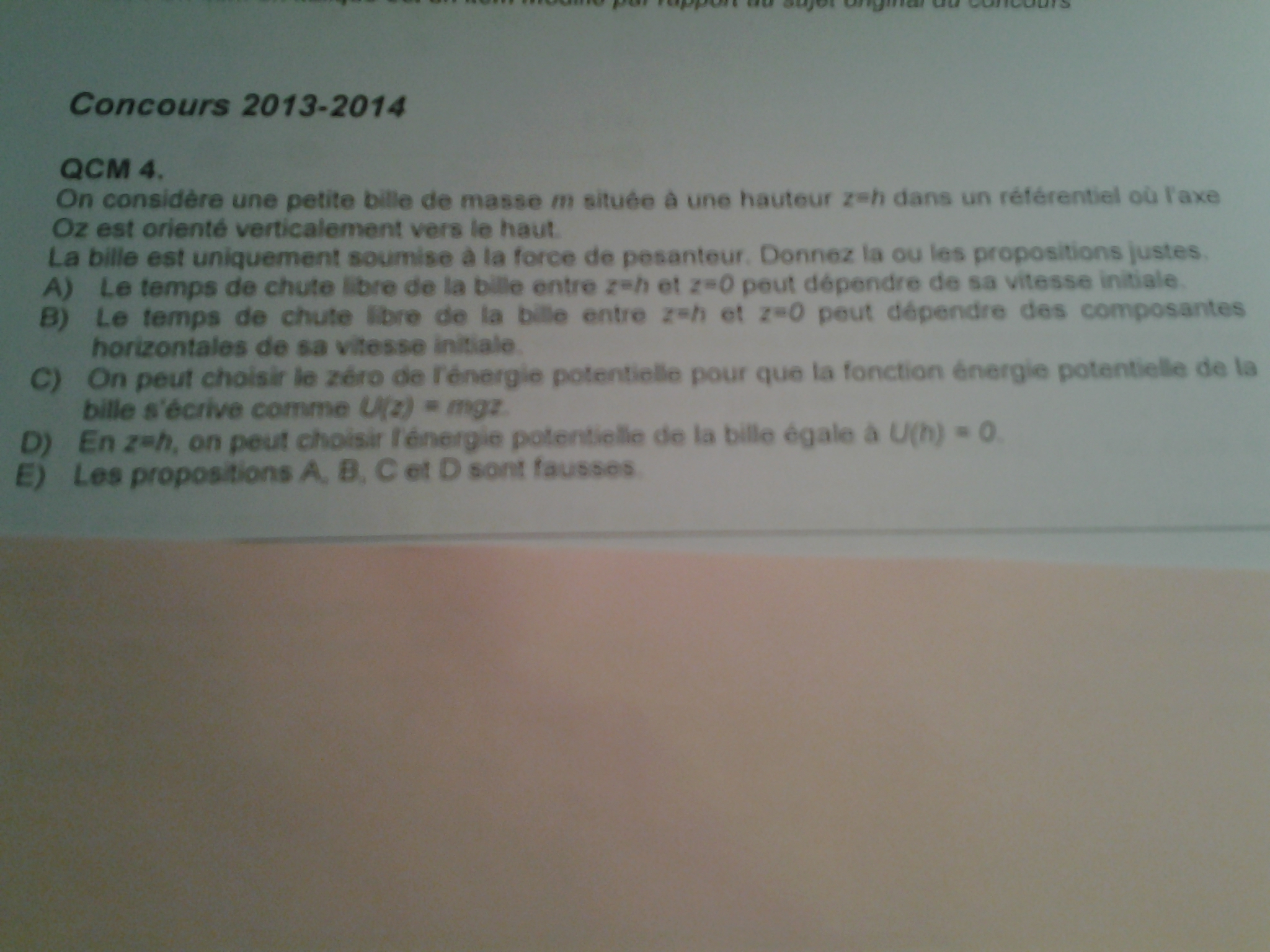 je ne comprends pas pourquoi l'item D est juste, j'ai regardé la correction et on dit qu'on prend h comme origine du repère (ok) mais pourtant en h l'energie potentielle est maximale non ?