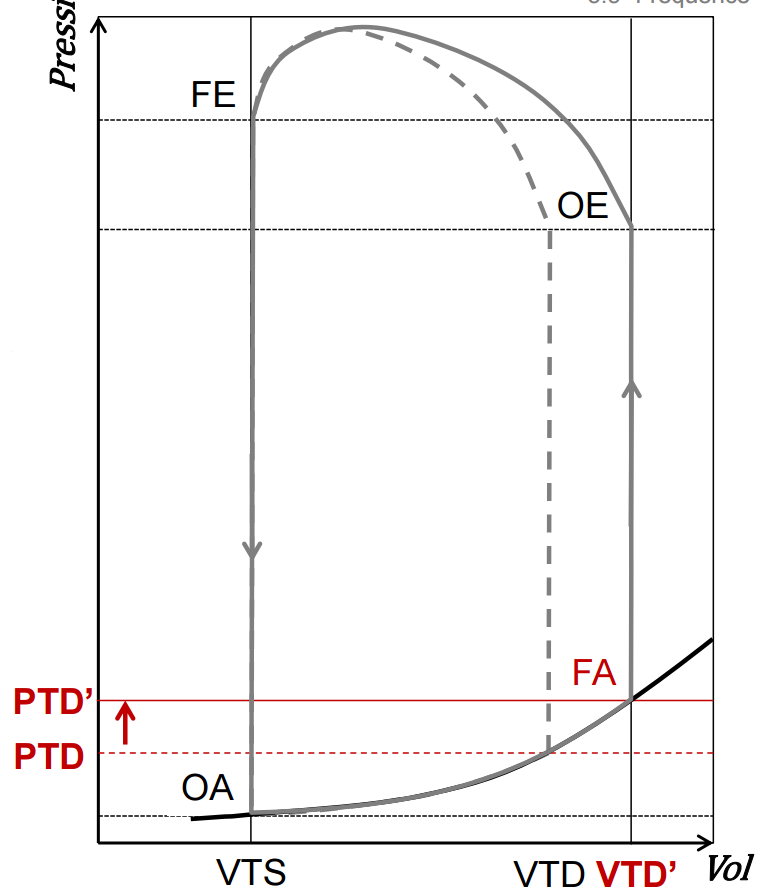 Cela entraîne donc une hausse de la PTD, et donc une modification de la courbe pression/volume. L'élévation de la pré-charge permet de "retarder" la fermeture de la valve d'admission (=nouvelle pression de fermeture de la valve d'admission): un volume plus conséquent de sang va passer dans le ventricule avant la FA et le début de la systole → le VTD augmente ! On aura donc une hausse du VES, de Q, et du travail mécanique WM "