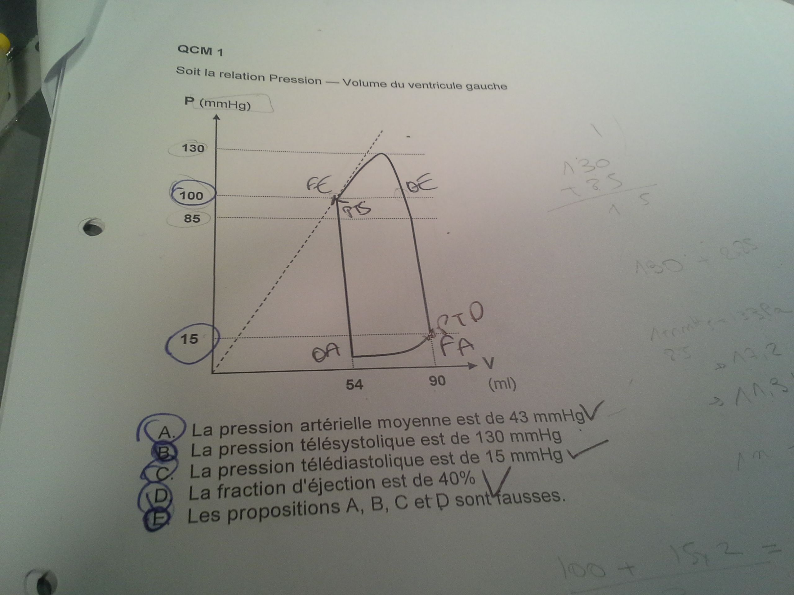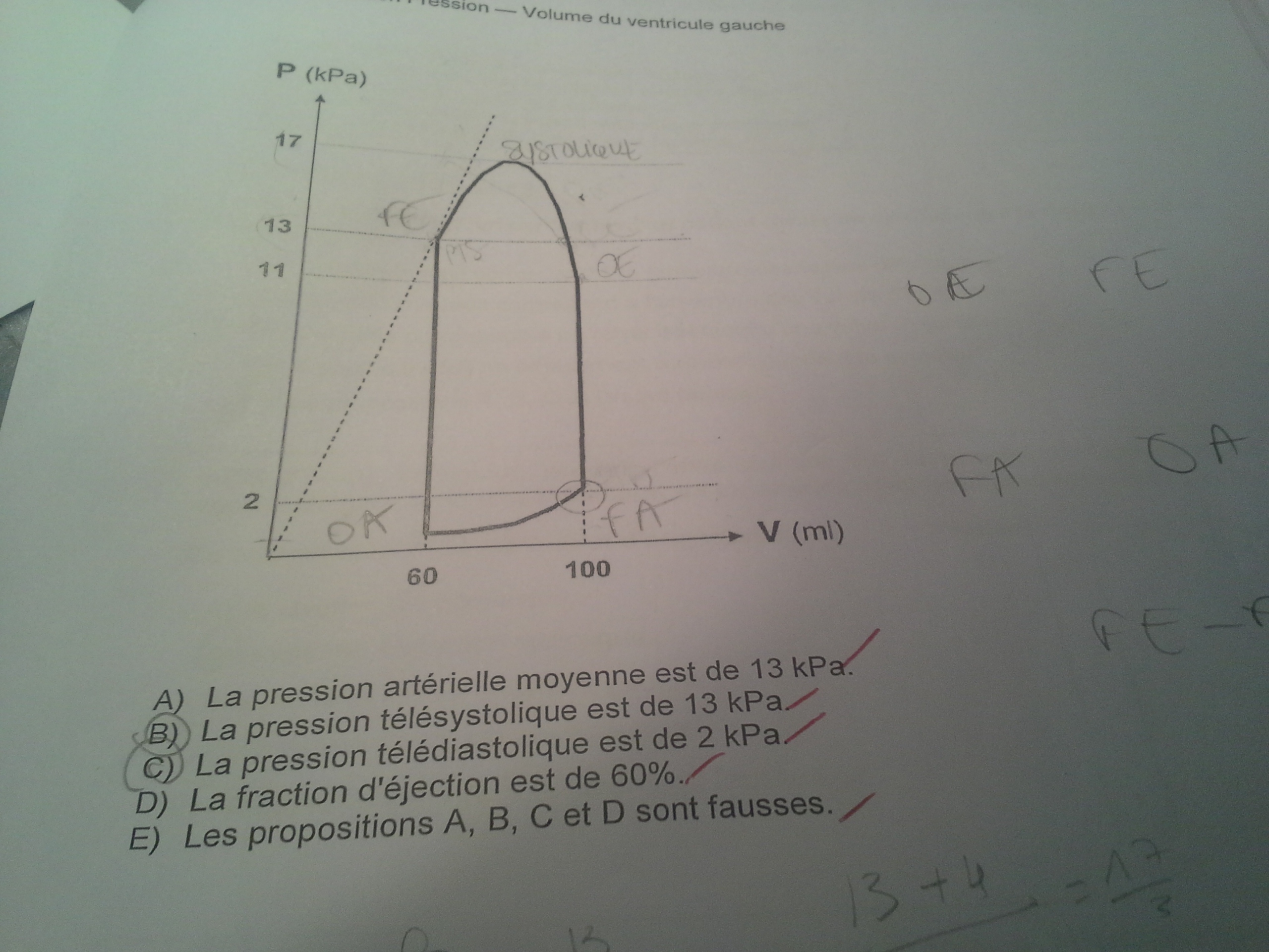 J'ai fais 2 qcms, l'an dernier, la correction du qcm 15, était BC, cette année, c'est passé à ABC, je ne comprends pas pourquoi, la A est vrai car, en prenant les valeurs de la PTD=2 et la PTS=13 cela ne marche pas, j'ai vu dans la correction qu'il fallait prendre Psystolique=17, et Pdiasytolique=11, du coup je me suis dit que je confondais PTS/PTS et Pdia/psys SAUF que en faisant un autre qcm, (le numéro 1), en prenant Psys=130 et Pdias=85 on ne trouvait pas 43mmgh alors que la correction dit que la A est vrai, mais cette correction là, prend, comme valeur le VTD=15 et le VTS=100