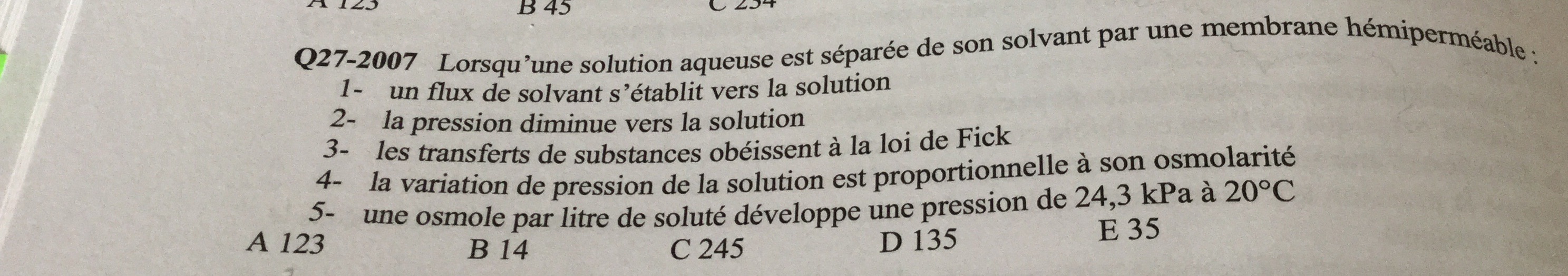 Pour la 4 : j'aurais mis 1, 3 et 5 (1. Le solvant diffuse vers le milieu avec une plus grande osmolarité, 2. La pression osmotique est plus élevée du coté de la solution, 3. Loi de Fick : diffusion, 4. Vrai si on parle de pression osmotique, 5. Non traité en cours)