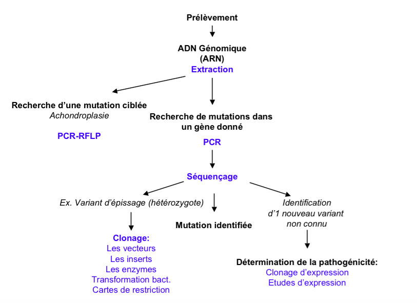 En fait en pratique, t'as un enfant sur qui tu suspectes une maladie MONOGENIQUE. Tu recherches les mutations causales, tu fais PCR-RLFP, PCR-Séquençage, tu peux aussi être amenée à faire un clonage moléculaire si variant d'épissage. Le clonage d'expression, c'est plus en recherche, pas en pratique c'est mise en culture de cellules eucaryotes manipulation génétique complexe création protéine fusion avec GFP par ex, transfection ect ect